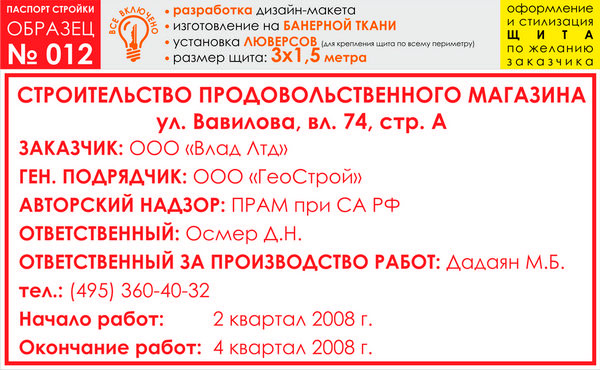 Паспорт стройки, образец № 12 (баннерная ткань, 3000х1500 cм) в Твери купить