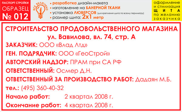 Паспорт стройки, образец № 12 (баннерная ткань, 2000х1000 cм) в Твери купить