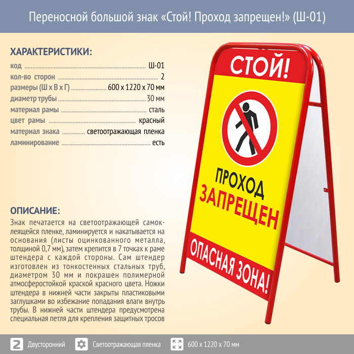 Переносной большой знак «Стой! Проход запрещен!» (Ш-01, двусторонний, светоотражающая пленка) в Твери купить