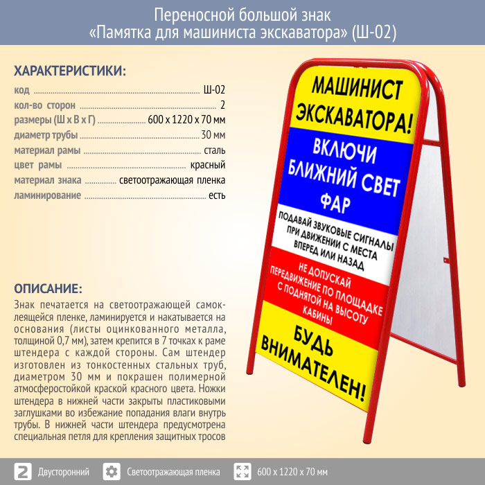 Переносной большой знак «Памятка для машиниста экскаватора» (Ш-02, двусторонний, светоотражающая пленка) в Твери купить