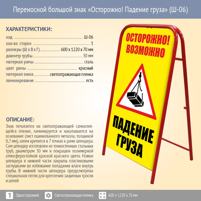 Переносной большой знак «Осторожно! Падение груза» (Ш-06, односторонний, светоотражающая пленка) в Твери купить
