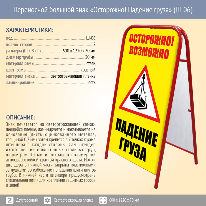 Переносной большой знак «Осторожно! Падение груза» (Ш-06, двусторонний, светоотражающая пленка) в Твери купить