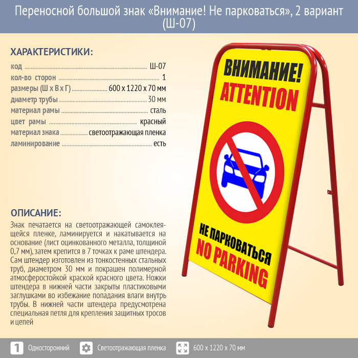 Переносной большой знак «Внимание! Не парковаться», 2 вариант (Ш-07, односторонний, светоотражающая пленка) в Твери купить