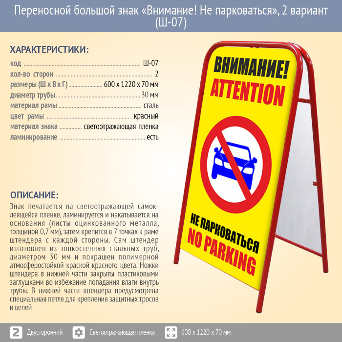 Переносной большой знак «Внимание! Не парковаться», 2 вариант (Ш-07, двусторонний, светоотражающая пленка) в Твери купить