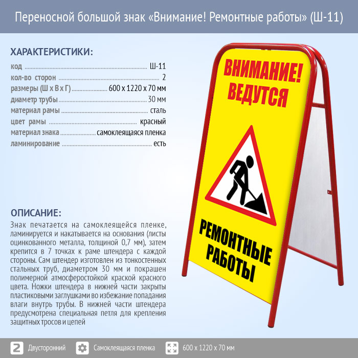 Переносной большой знак «Внимание! Ремонтные работы» (Ш-11, двусторонний, самоклеящаяся пленка) в Твери купить