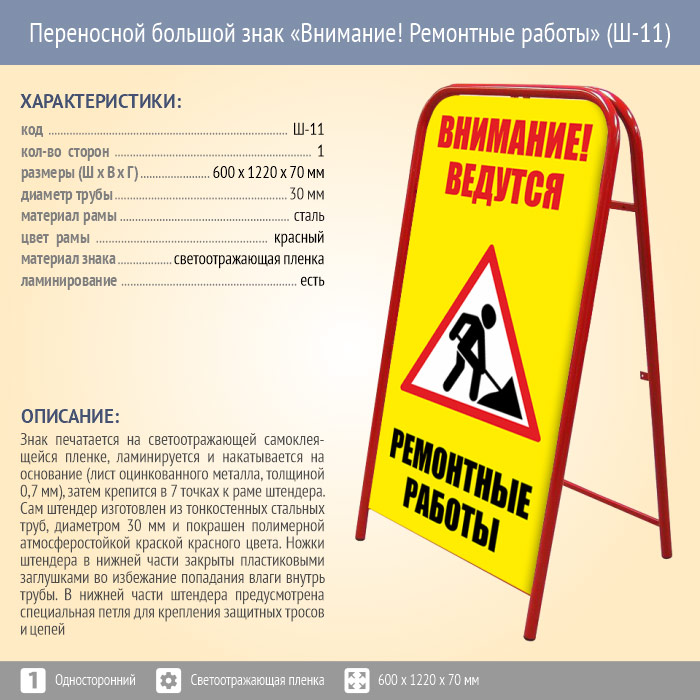 Переносной большой знак «Внимание! Ремонтные работы» (Ш-11, односторонний, светоотражающая пленка) в Твери купить