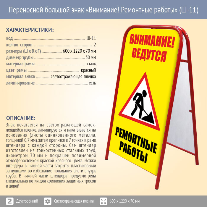 Переносной большой знак «Внимание! Ремонтные работы» (Ш-11, двусторонний, светоотражающая пленка) в Твери купить
