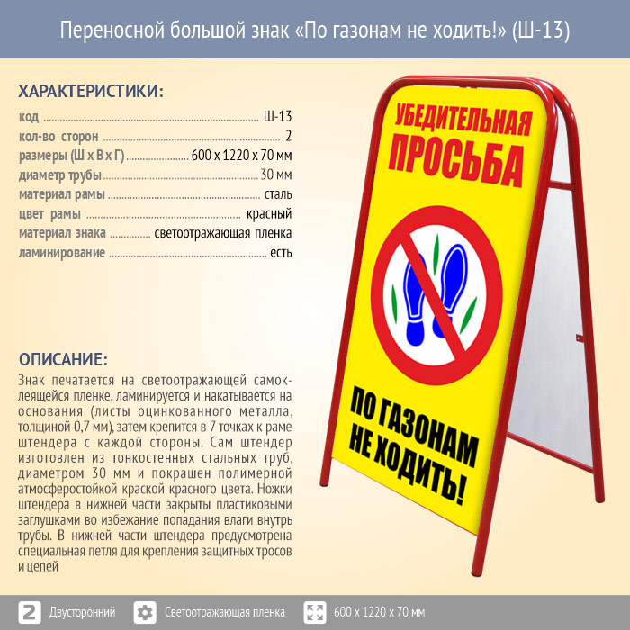 Переносной большой знак «По газонам не ходить!» (Ш-13, двусторонний, светоотражающая пленка) в Твери купить