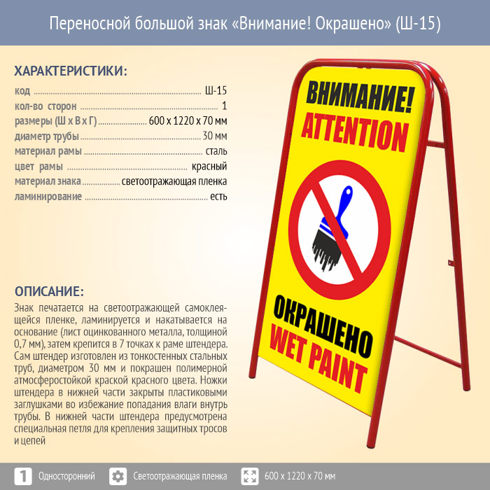 Переносной большой знак «Внимание! Окрашено» (Ш-15, односторонний, светоотражающая пленка) в Твери купить