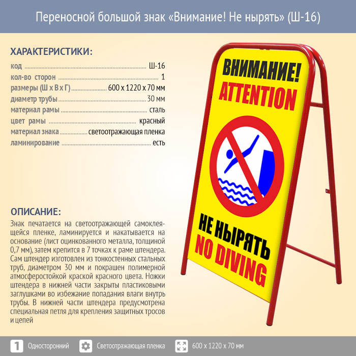 Переносной большой знак «Внимание! Не нырять» (Ш-16, односторонний, светоотражающая пленка) в Твери купить