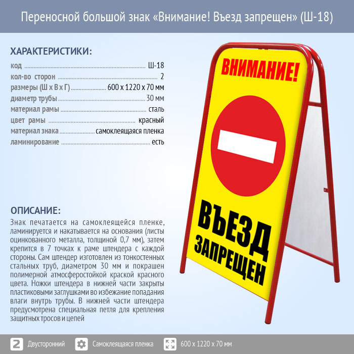 Переносной большой знак «Внимание! Въезд запрещен» (Ш-18, двусторонний, самоклеящаяся пленка) в Твери купить