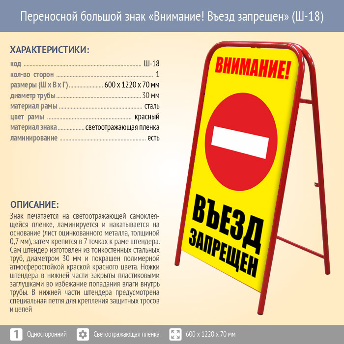 Переносной большой знак «Внимание! Въезд запрещен» (Ш-18, односторонний, светоотражающая пленка) в Твери купить