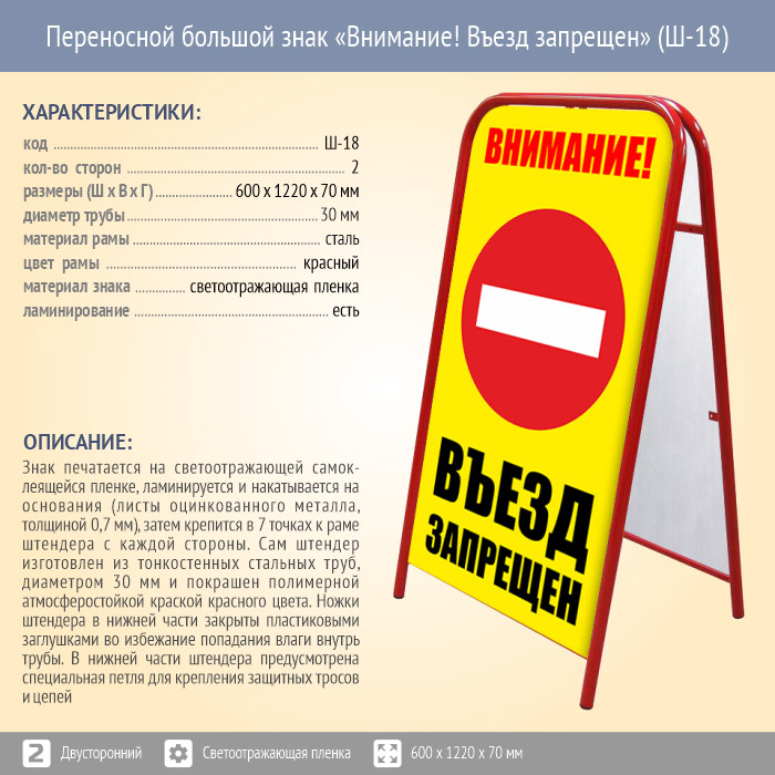 Переносной большой знак «Внимание! Въезд запрещен» (Ш-18, двусторонний, светоотражающая пленка) в Твери купить