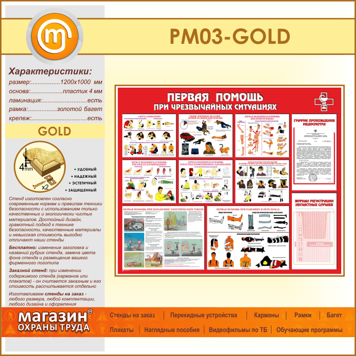 Стенд «Первая помощь при чрезвычайных ситуациях» с плоским и объемным карманами (PM-03-GOLD) в Твери купить