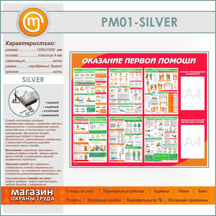 Стенд «Оказание первой помощи» с плоским и объемным карманами (PM-01-SILVER) в Твери купить