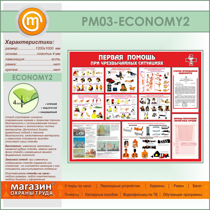 Стенд «Первая помощь при чрезвычайных ситуациях» с плоским и объемным карманами (PM-03-ECONOMY2) в Твери купить