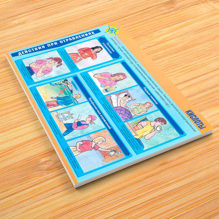 - Плакат «Кислоты» – признаки отравления, первая помощь, профилактика отравлений
