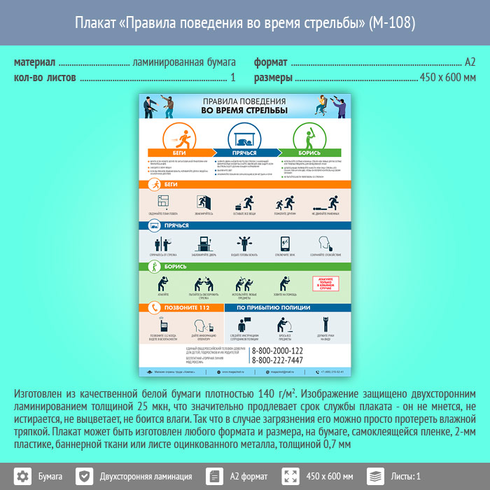 Плакат «Правила поведения во время стрельбы» (М-108, ламинированная бумага, А2, 1 лист) в Твери купить