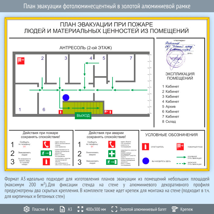 План эвакуации в золотой алюминиевой рамке (А3 формат) в Твери купить