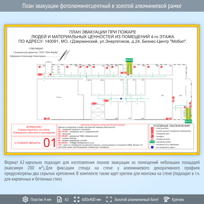 План эвакуации в золотой алюминиевой рамке (А2 формат) в Твери купить