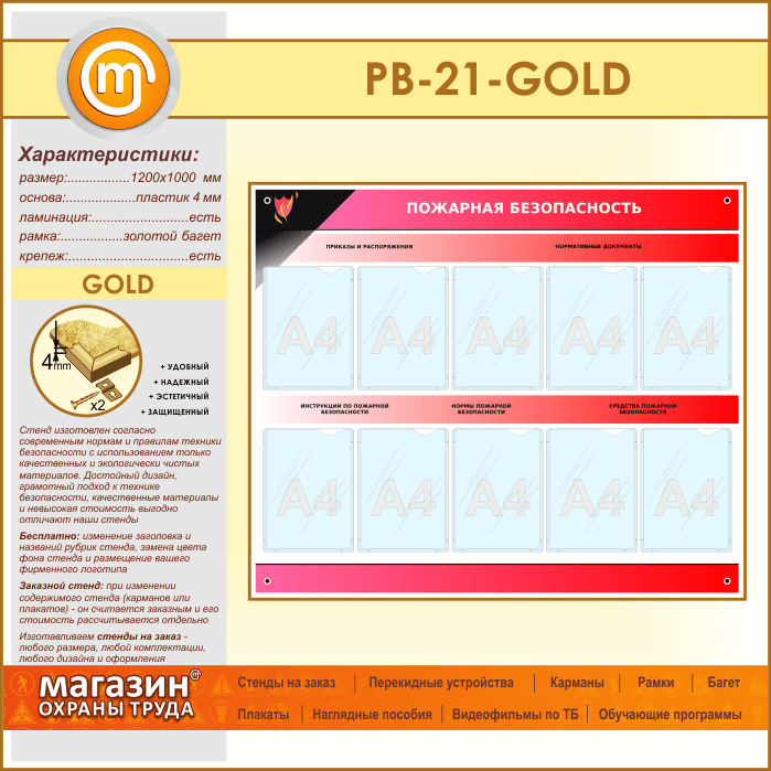 Стенд «Пожарная безопасность» с 10 карманами (PB-21-GOLD) в Твери купить