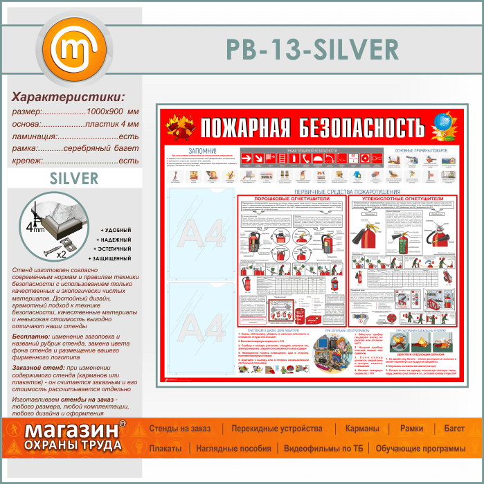 Стенд «Пожарная безопасность» с 2 карманами (PB-13-SILVER) в Твери купить