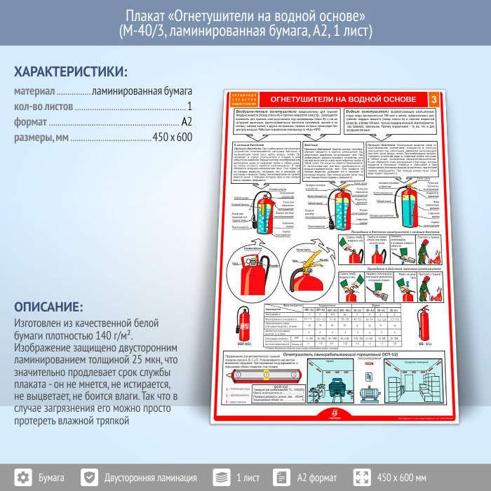 Плакат «Огнетушители на водной основе» (М-40/3, ламинированная бумага, А2, 1 лист) в Твери купить