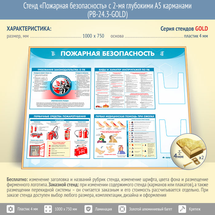 Стенд «Пожарная безопасность» с 2-мя глубокими А5 карманами (PB-24.3-GOLD) в Твери купить