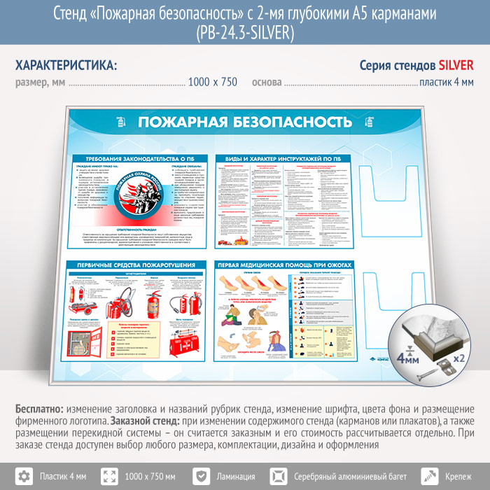 Стенд «Пожарная безопасность» с 2-мя глубокими А5 карманами (PB-24.3-SILVER) в Твери купить
