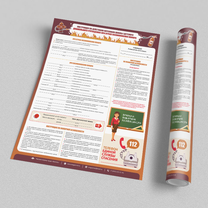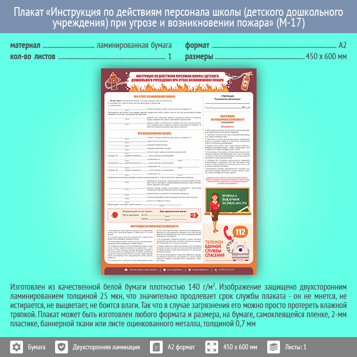 Плакат «Инструкция по действиям персонала школы (детского дошкольного учреждения) при угрозе и возникновении пожара» (М-17, ламинированная бумага, А2, 1 лист) в Твери купить