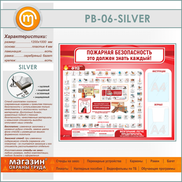 Стенд «Пожарная безопасность. Это должен знать каждый» с плоским и объемным карманами (PB-06-SILVER) в Твери купить