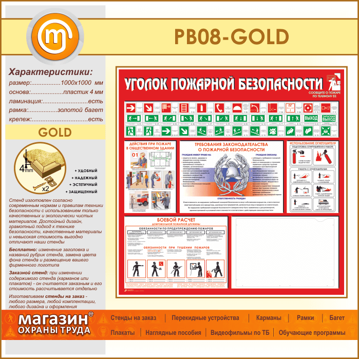 Стенд «Уголок пожарной безопасности» с карманом А3 формата (PB-08-GOLD) в Твери купить