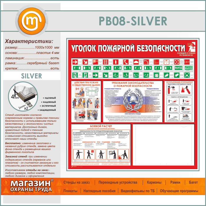 Стенд «Уголок пожарной безопасности» с карманом А3 формата (PB-08-SILVER) в Твери купить