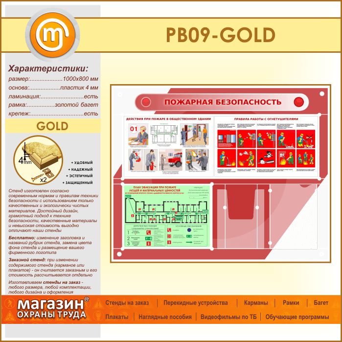 Стенд «Пожарная безопасность» с планом эвакуации, плоским и объемным карманами (PB-09-GOLD) в Твери купить