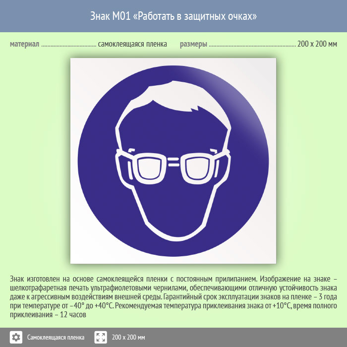 Знак M01 «Работать в защитных очках» (пленка, 200х200 мм) в Твери купить