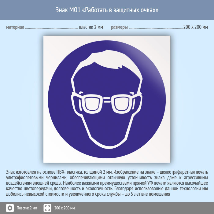 Знак M01 «Работать в защитных очках» (пластик, 200х200 мм) в Твери купить