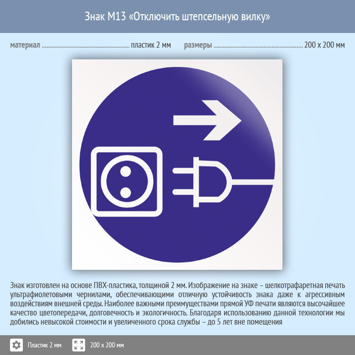 Знак M13 «Отключить штепсельную вилку» (пластик, 200х200 мм) в Твери купить
