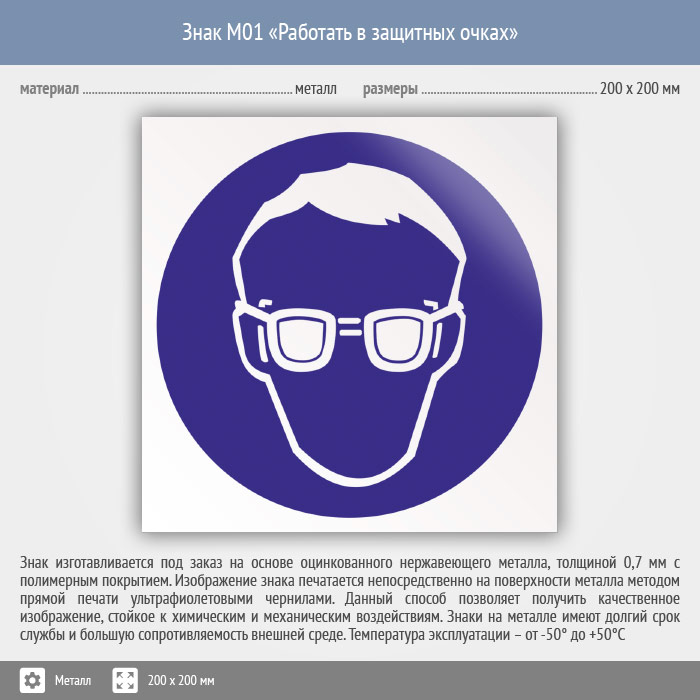 Знак M01 «Работать в защитных очках» (металл, 200х200 мм) в Твери купить