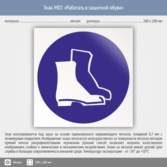 Знак M05 «Работать в защитной обуви» (металл, 200х200 мм) в Твери купить