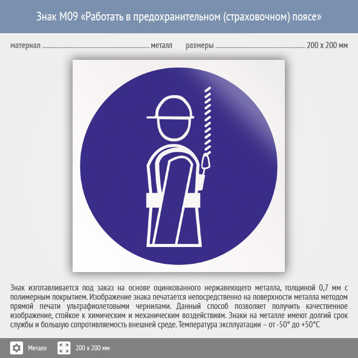 Знак M09 «Работать в предохранительном (страховочном) поясе» (металл, 200х200 мм) в Твери купить