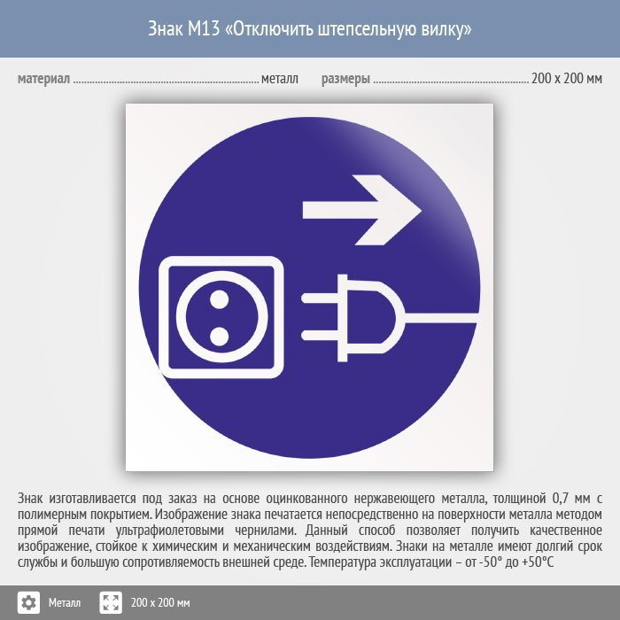 Знак M13 «Отключить штепсельную вилку» (металл, 200х200 мм) в Твери купить