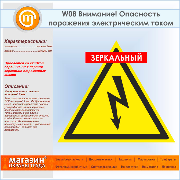 Знак W08 «Внимание! опасность поражения электрическим током» (пластик, сторона 200 мм) (знак зеркально отражен) в Твери купить