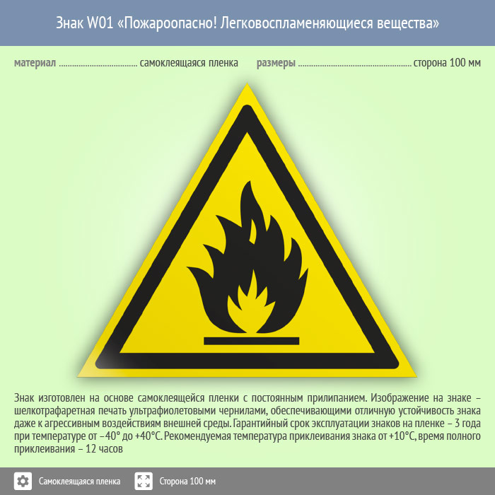 Знак W01 «Пожароопасно! легковоспламеняющиеся вещества» (пленка, сторона 100 мм) в Твери купить