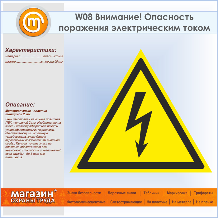 Знак W08 «Внимание! опасность поражения электрическим током» (пластик, сторона 50 мм) в Твери купить