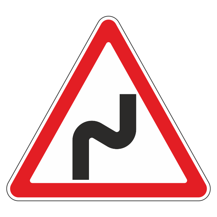 Дорожный знак 1.12.1 «Опасные повороты с первым поворотом направо» (металл 0,8 мм, II типоразмер: сторона 900 мм, С/О пленка: тип Б высокоинтенсивная) в Твери купить