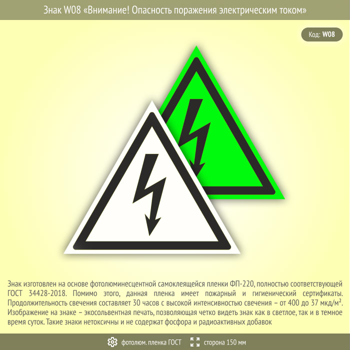 Знак W08 «Внимание! Опасность поражения электрическим током» (фотолюминесцентная пленка ГОСТ 34428-2018, сторона 150 мм) в Твери купить