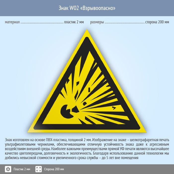 Знак W02 «Взрывоопасно» (пластик, сторона 200 мм) в Твери купить
