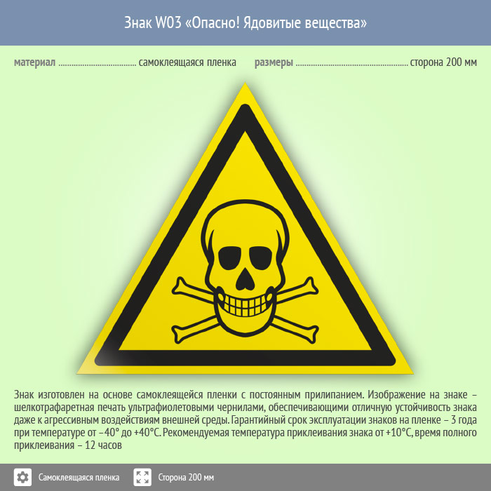 Знак W03 «Опасно! ядовитые вещества» (пленка, сторона 200 мм) в Твери купить