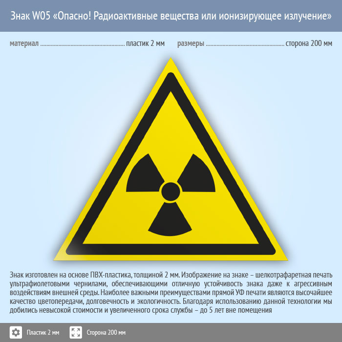 Знак W05 «Опасно! радиоактивные вещества или ионизирующее излучение» (пластик, сторона 200 мм) в Твери купить