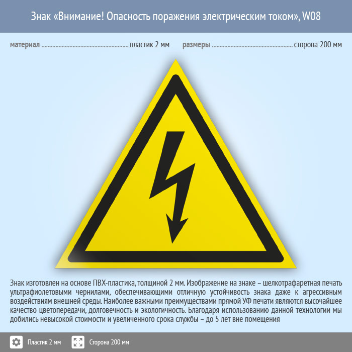 Знак W08 «Внимание! опасность поражения электрическим током» (пластик, сторона 200 мм) в Твери купить